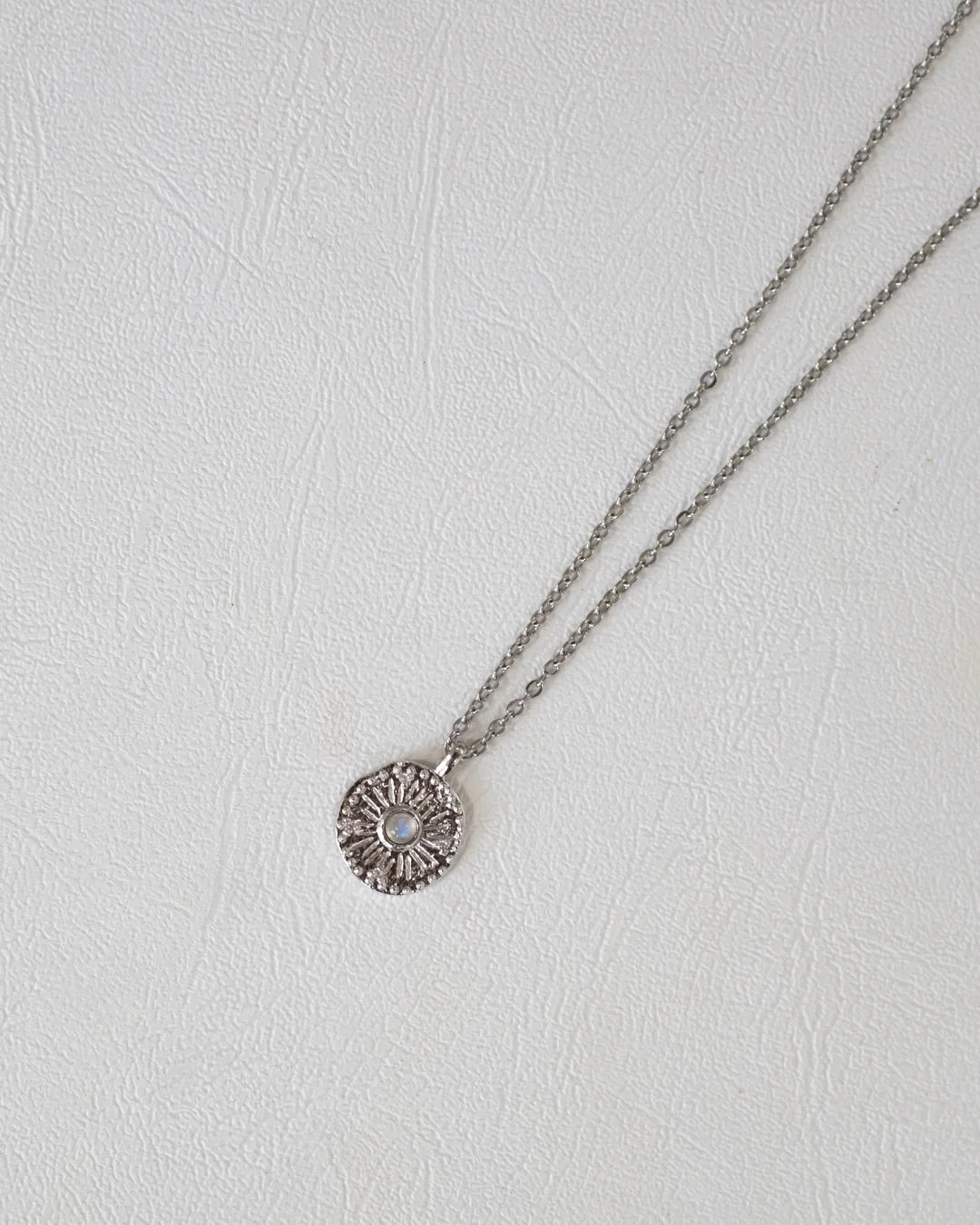 Notre chaîne Dalia, avec son médaillon rond et sa pierre de labradorite apporte une touche simpliste à votre look.