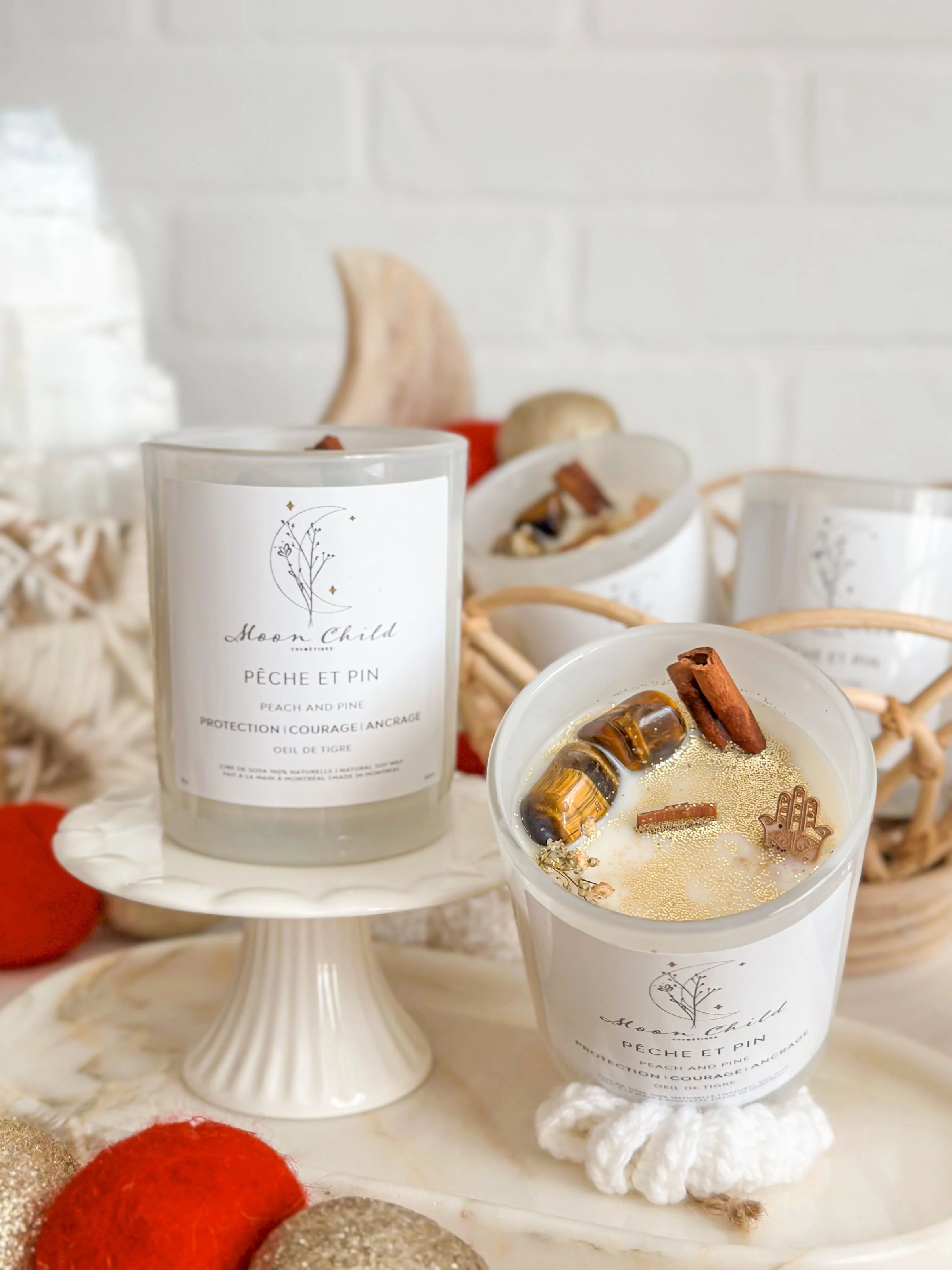 Nos chandelles ont une mèche en bois qui crépite ce qui est vraiment relaxant. Nous avons choisi la cire de soya parce qu’elle ne dégage aucune émanation toxique ou fumée noire. Les odeurs sont naturelles, donc légères, sans phtalate et sans paraben. Elles ont toutes des fleurs et un cristal que vous pouvez garder par la suite.