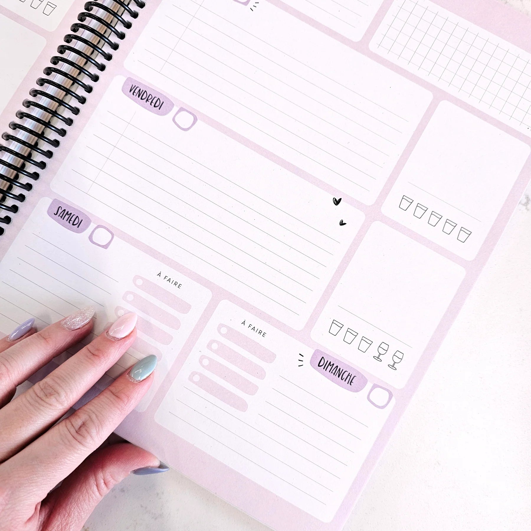 • Chaque mois contient 5 semaines sur 2 pages incluant une section journalière pour la planification des repas et de suivi de consommation d'eau.