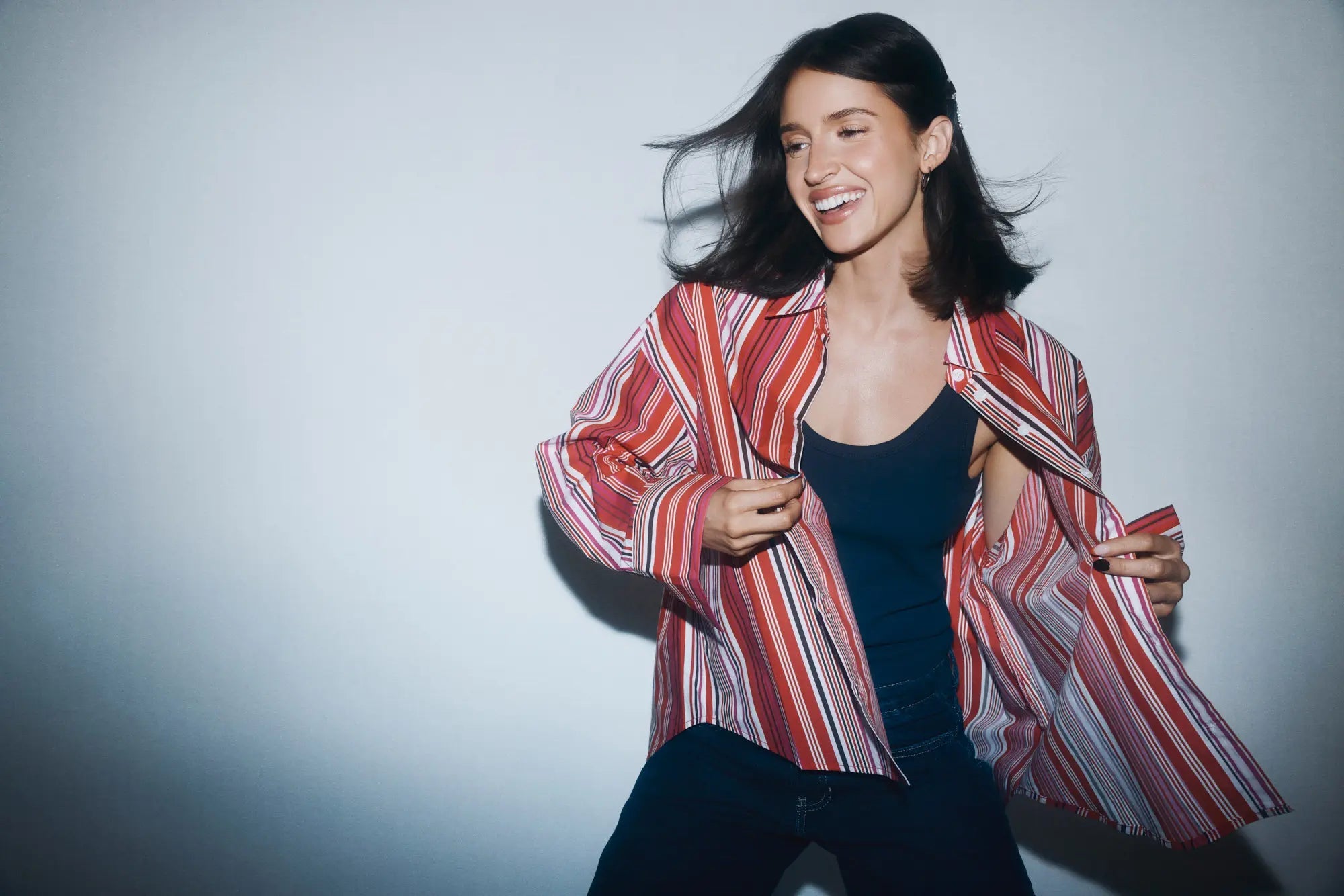 La coupe : La Chemise Cool Kid capture l’énergie des journées animées où l’on se sent libre de flâner. Elle a ce petit quelque chose qui rappelle les looks iconiques à la fois décontractés et pleins de caractère de Lorelai Gilmore. Ses rayures verticales structurent la silhouette tout en lui donnant de l’élan. Légère, fluide et affirmée, c’est la chemise faite pour les femmes qui, comme Lorelai, avancent vite, vivent fort et ne s’excusent jamais d’être elles-mêmes.