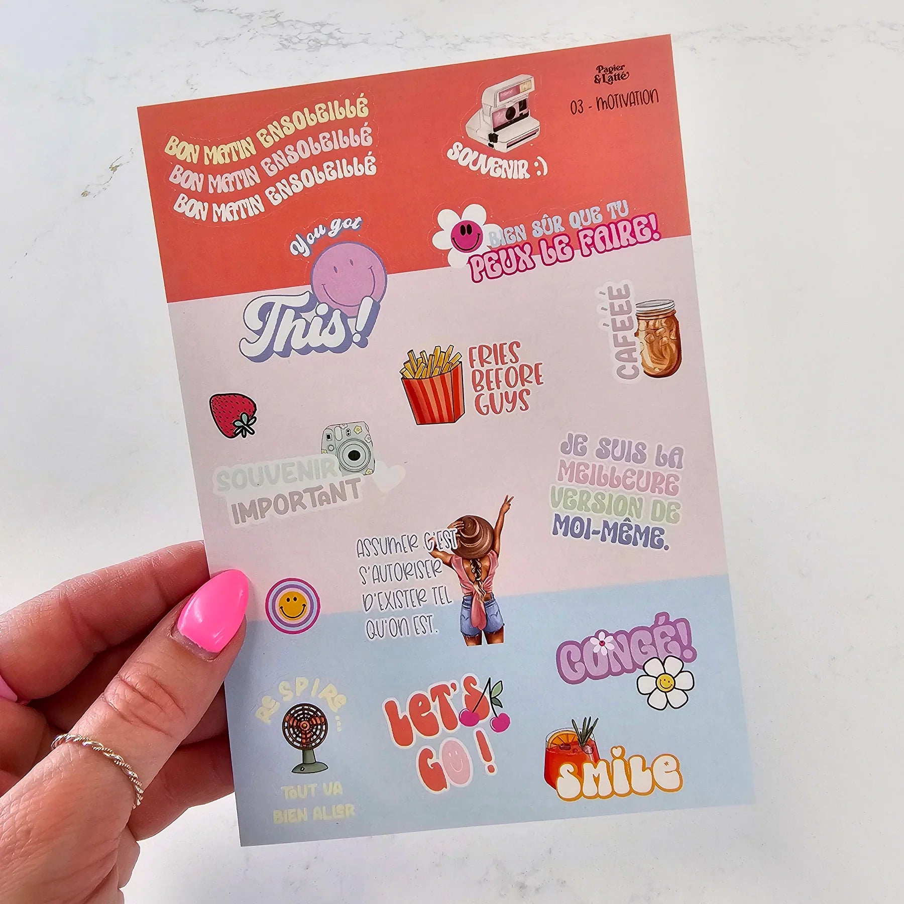 Les enfants ont une fascination sans bornes pour les autocollants. Et que sont les adultes, sinon de grands enfants? On va se le dire ; décorer quelque chose avec des collants, c’est chouette. C’est donc le temps de sortir son fou et de s’amuser à en mettre partout! Utilisez-les dans vos agendas, vos cahiers, en scrapbooking, dans une carte etc...