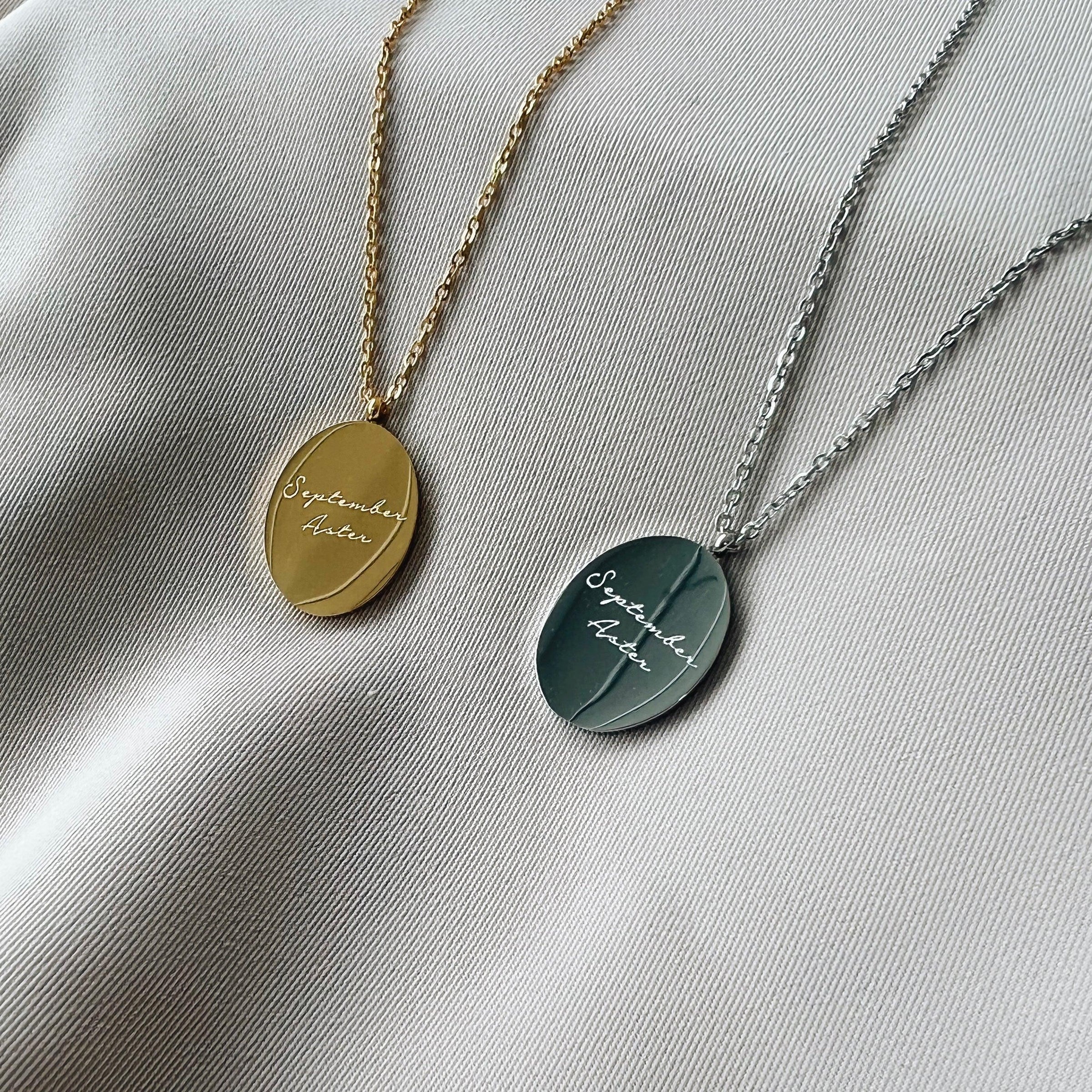 Collier à base d'acier inoxydable orné d'un médaillon avec une gravure de la fleur de votre mois de naissance: l'aster. De l'autre côté du médaillon, gravure du mois de naissance et du nom de la fleur qui y est associée, en anglais.